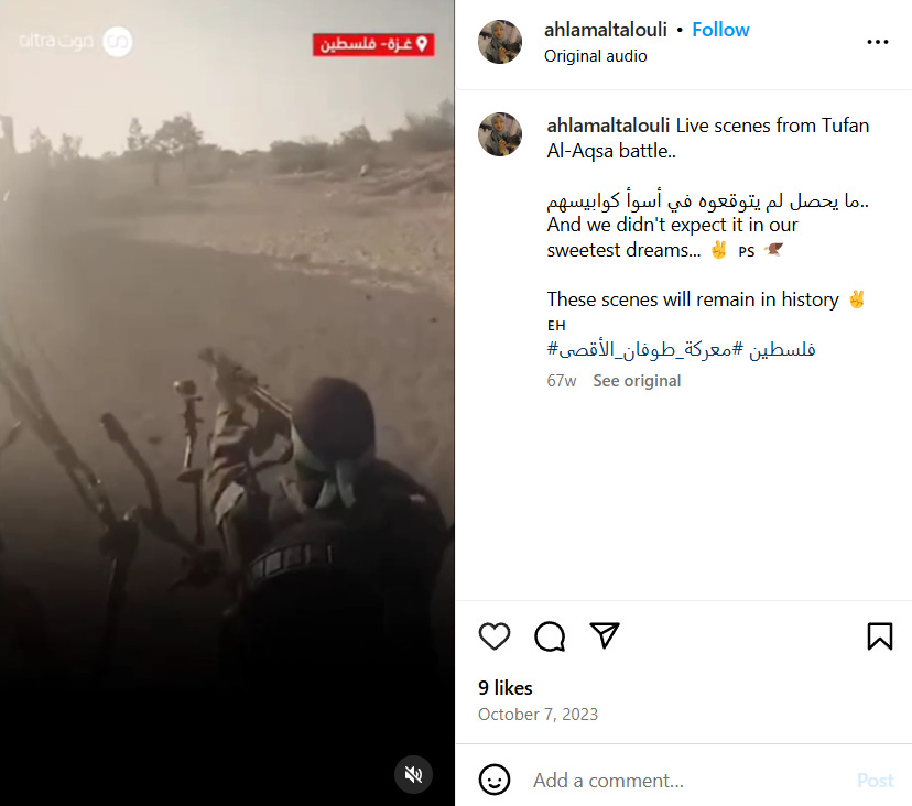 On the morning of October 7th, Ahlam posted a video of Hamas terrorists invading Israel and wrote "Deployment of Al-Qassam members inside the occupation's settlements. May God protect them, and may our Lord be with them, O Lord.”