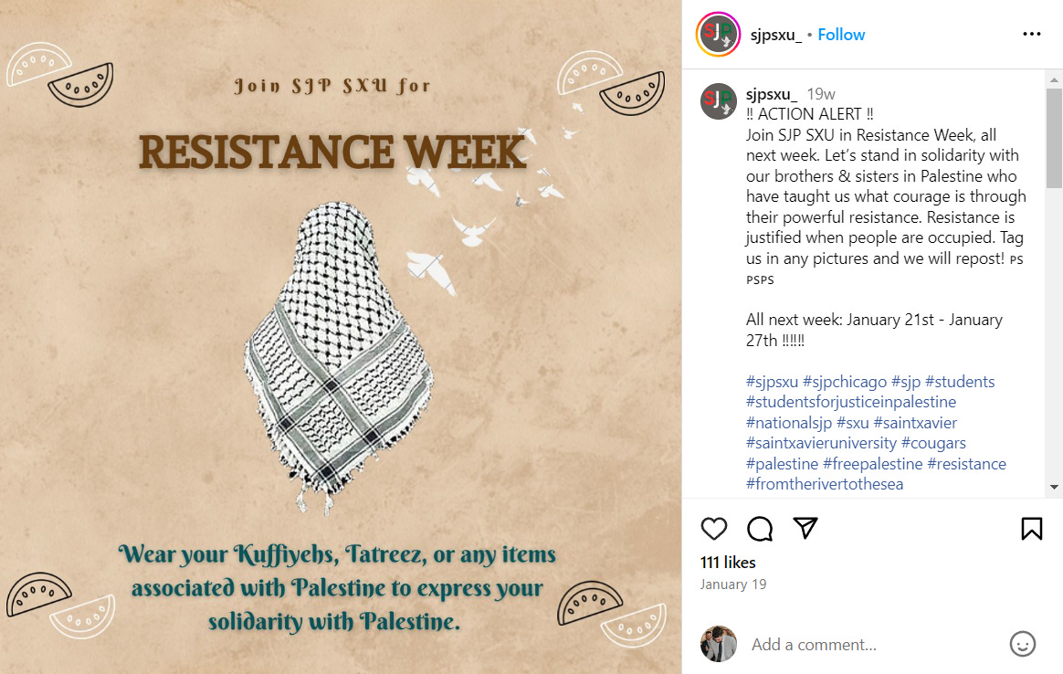 In January, SXU SJP held an event glorifying the First Intifada, a violent Palestinian uprising during which hundreds of Israelis were murdered. It also launched a “Resistance week” (i.e. terrorism week) to “stand in solidarity with our brothers & sisters in Palestine who have taught us what courage is through their powerful resistance.”