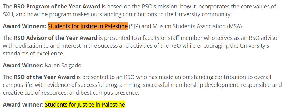 The issue here isn’t that a Catholic University awarded a non-Catholic group; the issue is that the group in question has a well-documented history of supporting Palestinian terrorism (and that’s to say nothing of SXU SJP’s parent group, National SJP, which maintains ties to Hamas and has hosted terrorists at its events).