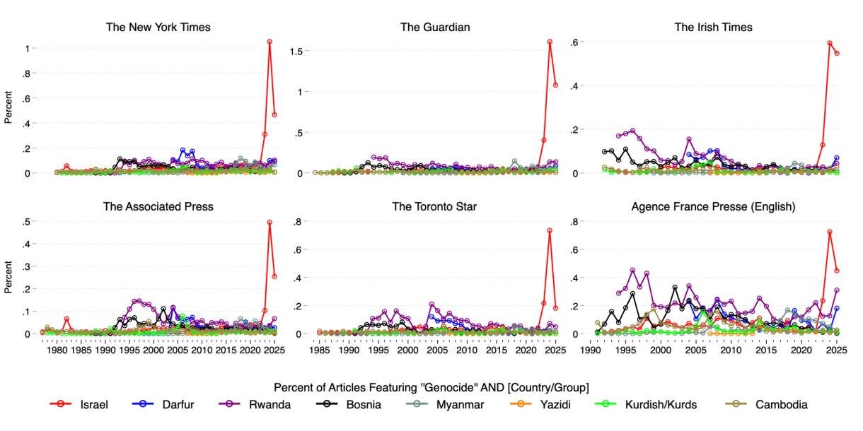 Moreover, a Tablet Magazine analysis found that the number of Times articles pairing “Israel” and “genocide” during the war was more than nine times higher than the paper’s peak mentions of genocide in Rwanda and nearly six times higher than during Darfur. This isn’t the cautious use of a grave legal term—it’s hyperbolic repetition, designed to imprint a frame in the public mind.