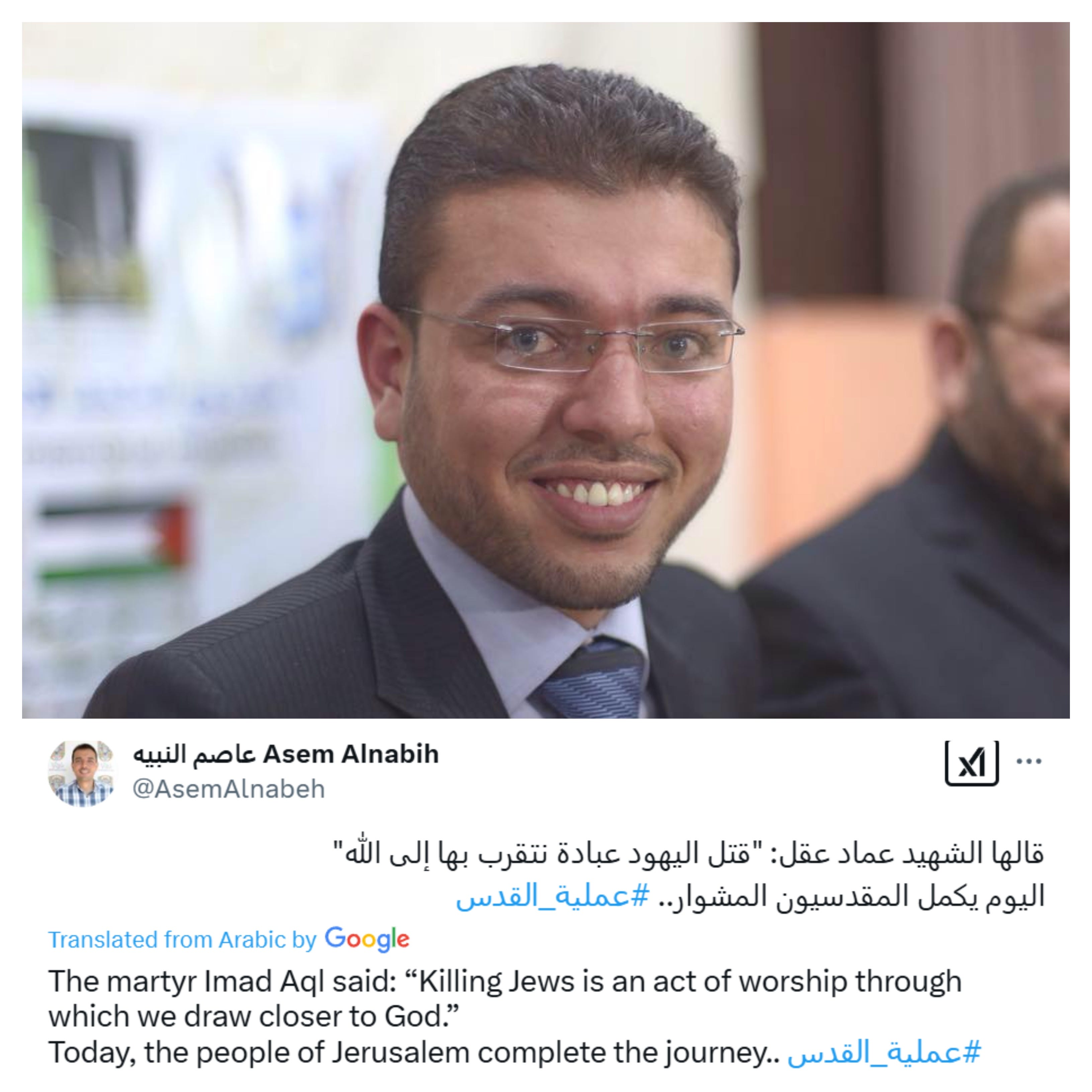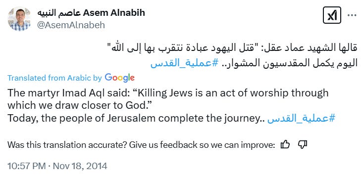 Ali Abunimah, the ever-reliable Hamas apologist who runs Electronic Intifada is well aware of Alnabih’s role in the Hamas government, and has explictly acknowledged this on EI. To him and his ilk, Hamas isn’t a terrorist organization but a noble “decolonial” force bravely resisting the “Zionist” menace. Naturally, on his site, Israelis are always “Zionists,” never Jews—an intentional dodge to obscure the true nature of his animus.