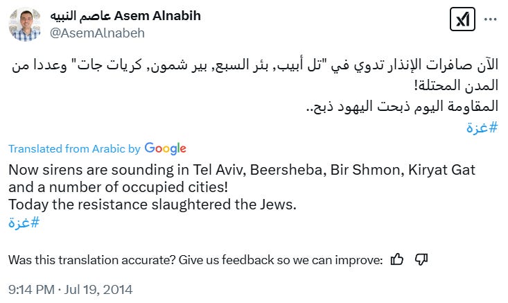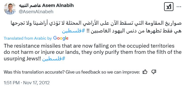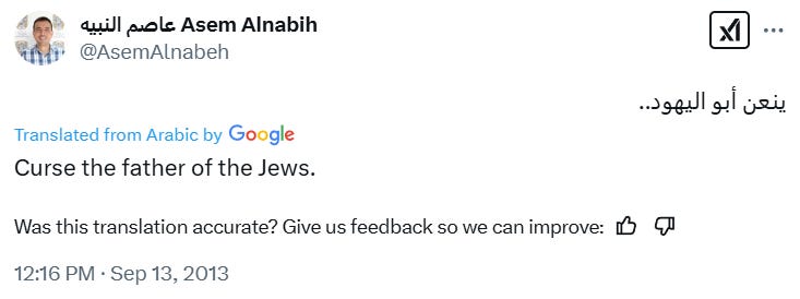 But Alnabih isn’t quite as skilled in the mental and linguistic gymnastics as some of his fellow Electronic Intifada contributors. True to his role in the terrorist organization, Alnabih—who’s also penned nearly 40 pieces for the Hamas mouthpiece Al Jazeera—has openly let his antisemitic freak flag fly on X, posting multiple screeds over the years that would make Goebbels blush. Here are some of the more colorful ones: