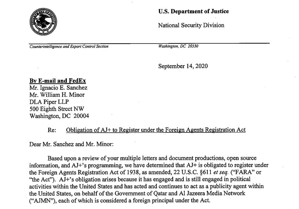 It sounds nice, but it’s a blatant lie. Qatar’s foreign influence activity is not “all registered and transparent.” In September 2020, the U.S. Department of Justice ordered AJ+, a Washington-based subsidiary of Al Jazeera, to register as a foreign agent under FARA. Trump’s DOJ laid out in black and white how AJ+ is controlled from top to bottom by the Qatari government. Five years later, and AJ+ has simply refused to register — in complete violation of American law.