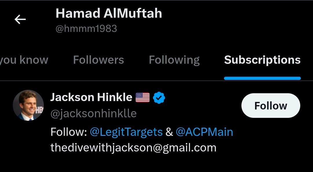 And here’s a revealing coda. After I exposed Al-Mufta’s dishonesty, an anonymous user on X pointed out that the only account he personally pays to subscribe to is none other than Jackson Hinkle — arguably the biggest professional liar on the platform. Which means Qatar’s deputy ambassador is literally funding Hinkle, at least in the form of that subscription.