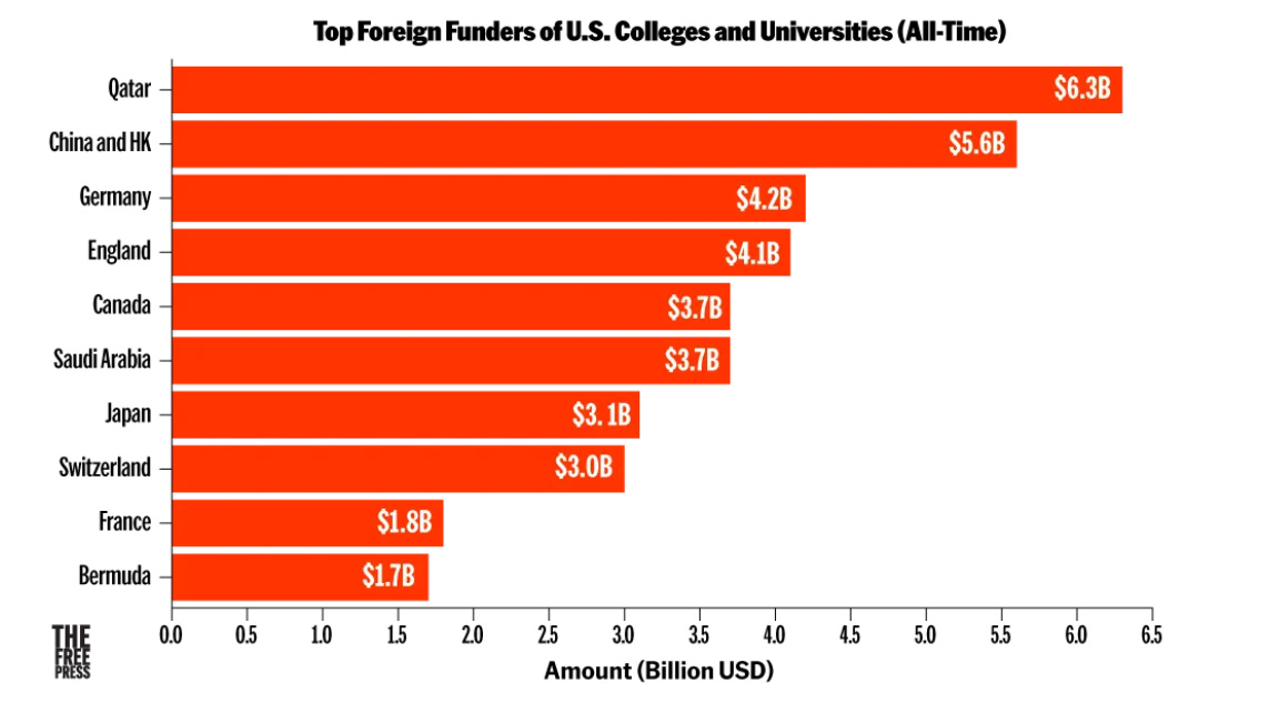 That last figure is astonishing. Qatar is the single largest foreign funder of U.S. colleges and universities in history. The next closest? China and Hong Kong at $5.6 billion. Germany follows with $4.2 billion, England with $4.1 billion, and Saudi Arabia/Canada at $3.7 billion.