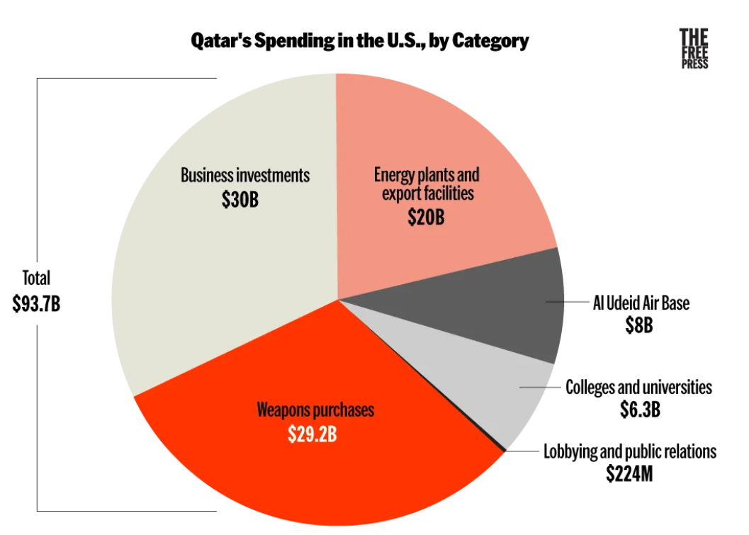 Lobbying is just the beginning. According to The Free Press, Qatar’s overall U.S. footprint adds up to $93.7 billion, broken down like this: