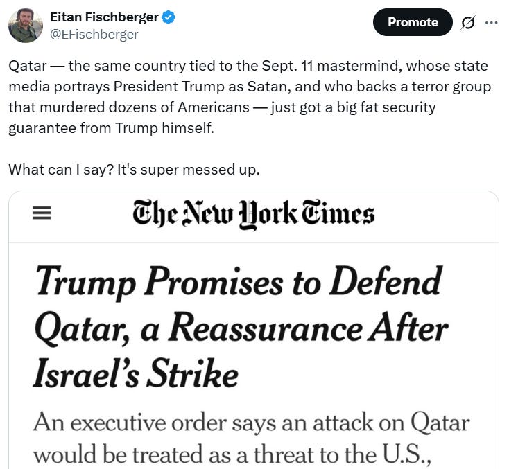 These lobbiysts and PR firms were well worth the investment. Earlier this year, the Washington Examiner’s Robert Schmad exposed that since Trump’s 2024 win, Qatar has ramped up efforts to sway conservative media, with over half its foreign-agent outreach now targeting right-leaning outlets (up from ~10% before). This includes paying $180k per month to a firm that secured a Tucker Carlson interview for the Qatari prime minister and pitching favorable stories to Fox, the New York Post, and others — some of which ran soon after.