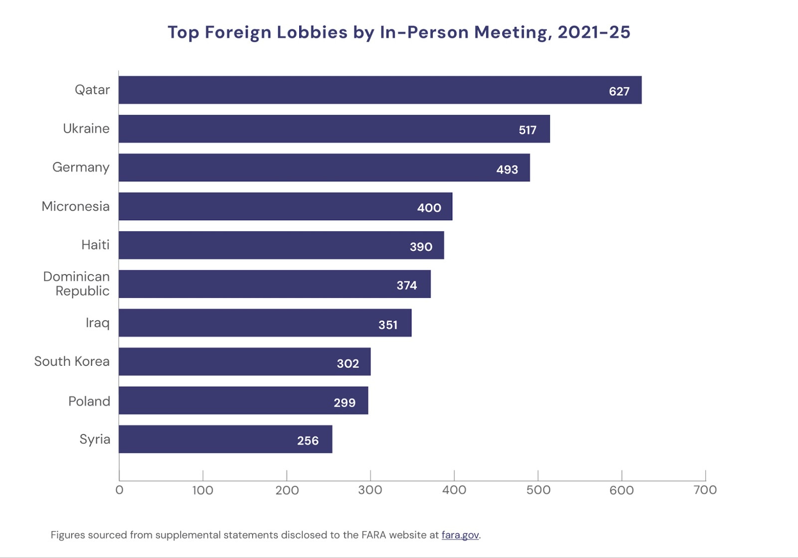 Since 2016, Qatar has spent nearly $250M on 88 lobbying and PR firms, logging 627 in-person political meetings from 2021–25 — more than any other country.