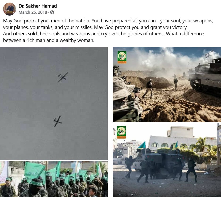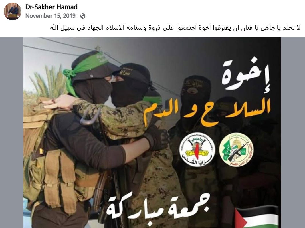 “May God protect you and grant you victory.”In 2019, he shared a photo of Hamas and Islamic Jihad terrorists embracing, rebuking anyone who wished for their separation and writing: