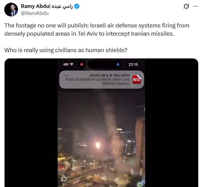 The false equivalency between Israel and Hamas has reached such deranged levels that Hamas propagandists are now claiming Israel is “using human shields” simply for placing Iron Dome batteries in Tel Aviv to protect its civilians from Iranian missile barrages.